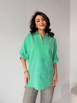 Туніка-сорочка дуже зручного крою з рукавом реглан. На горловині відкрита планка і комір-стійка. Рукав застібається на застібку. Спинка трохи подовжена. Сорочка оздоблена декоративною вишивкою класичного Українського мотиву "Хрест", що працює як оберіг від злих духів, символ Творця і сонця.