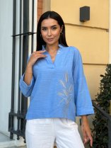 Витончена блуза прямого крою з V-подібним вирізом, прикрашена стильним принтом "турецькі огірки". Модель має короткі рукави та розрізи з боків, що надає їй елегантності та універсальності. Ця блуза ідеально підходить як для ділових зустрічей, так і для вечірніх прогулянок. Легка і приємна до тіла тканина забезпечує комфорт протягом усього дня, а модний дизайн додає вашому стилю свіжості та шарму. Легко комбінується з різними елементами гардеробу, створюючи стильні та жіночні образи.